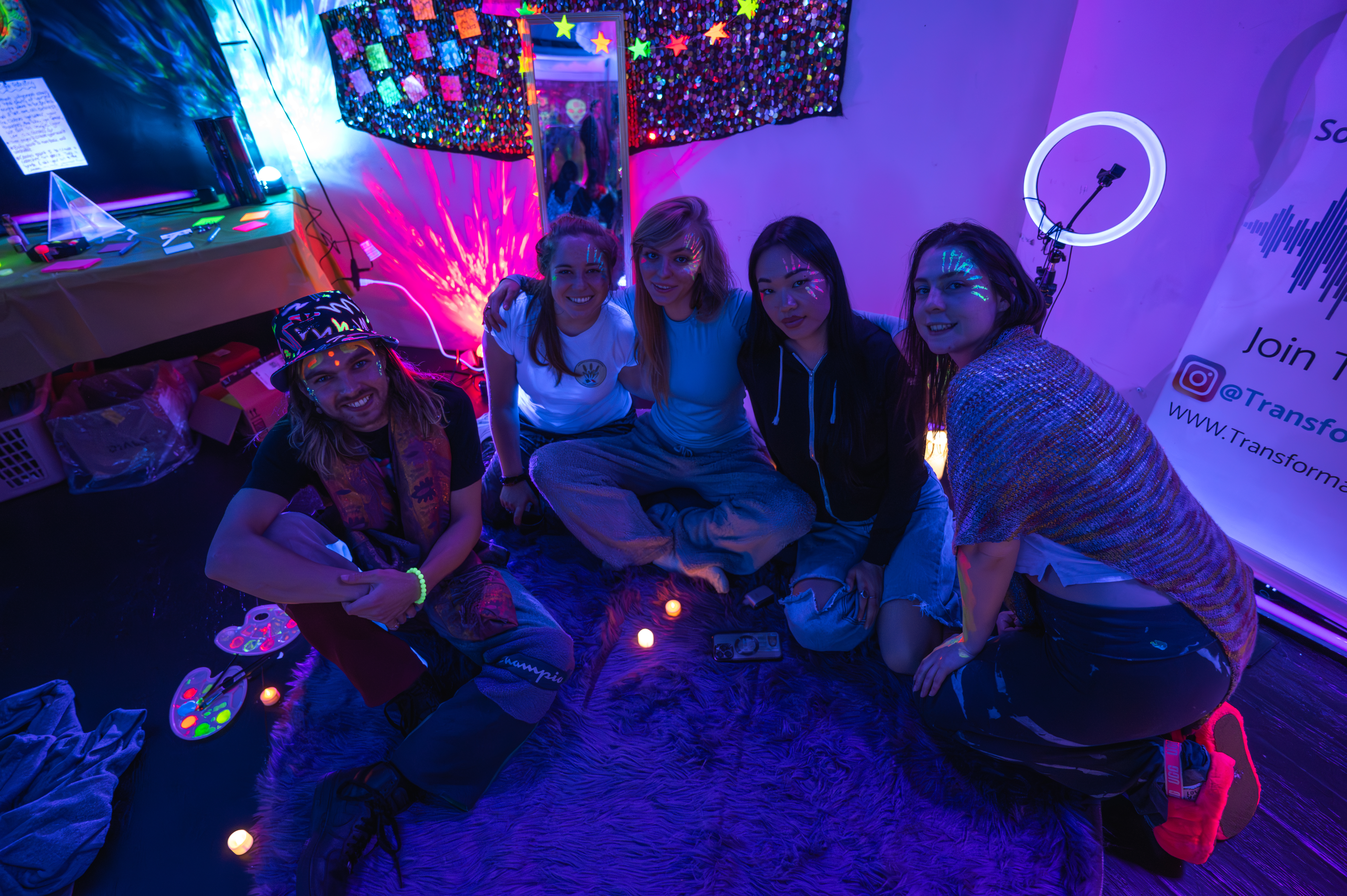 Under soft UV glow, the studio transforms into a dreamlike sanctuary. Neon accents, glow elements, and cosmic tones create an environment that feels otherworldly yet deeply grounding. The black light is not stimulating, it’s intentionally low, creating a safe, womb-like atmosphere that supports introspection, presence, and emotional release.